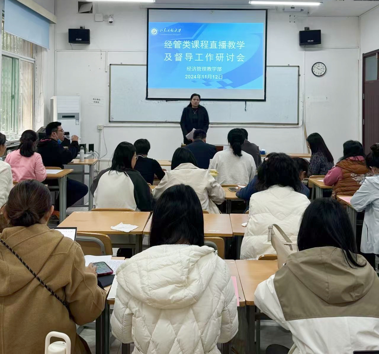 为贯彻全国教育大会精神,落实学校四项重点工作任务,提高经管类课程直播课教学质量,强化直播督导效果,11月12日,学校在舜耕校区115教室召开经管类课程直播教学及督导工作研讨会。党委委员、党委宣传部(教师工作部)部长刘忠强,教务处处长邹燕出席会议并讲话。经济管理教学部主任董彩云主持会议。