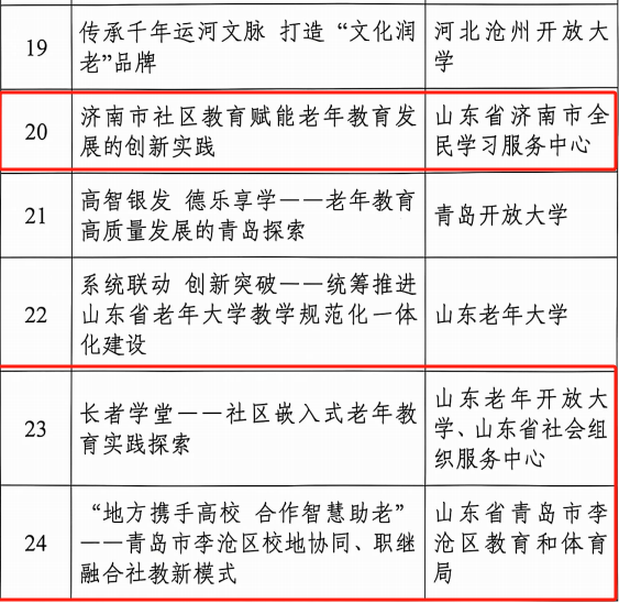 近日,国家老年大学下发了《关于公布国家老年大学2024年老年教育优秀案例推介名单的通知》,公布了2024年老年教育优秀案例推介名单。国家老年大学山东分部上报的3个优秀案例入选,分别是山东老年开放大学与山东省社会组织服务中心的《长者学堂——社区嵌入式老年教育实践探索》、山东省济南市全民学习服务中心的《济南市社区教育赋能老年教育发展的创新实践》、山东省青岛市李沧区教育和体育局的《“地方携手高校 合作智慧助老”——青岛市李沧区校地协同、职继融合社教新模式》。