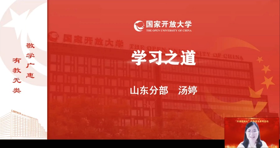 5月9日,我校教师汤婷受邀担任国家开放大学“办学体系教师共读书”系列活动分享嘉宾,以《学习之道》为题,与国家开放大学办学体系教师交流读书心得,共享学习成果。