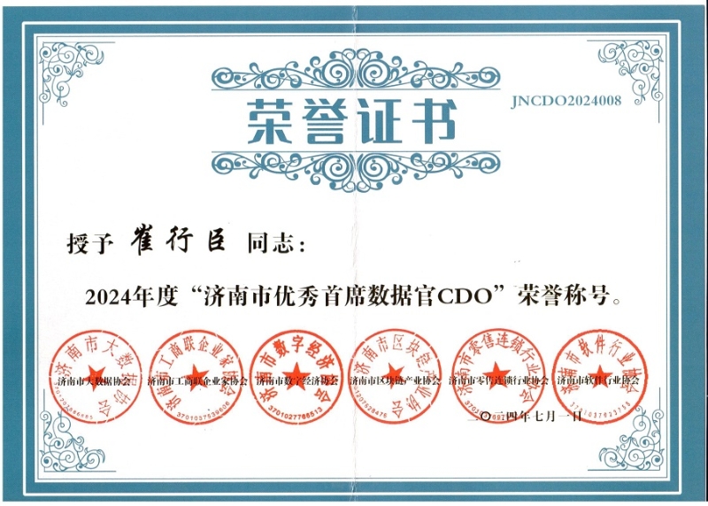 2024年度济南市优秀首席数据官(CDO)评审结果日前发布,共评选出117名优秀首席数据官。我校信息技术中心高级工程师崔行臣荣获“2024年度济南市优秀首席数据官”称号。