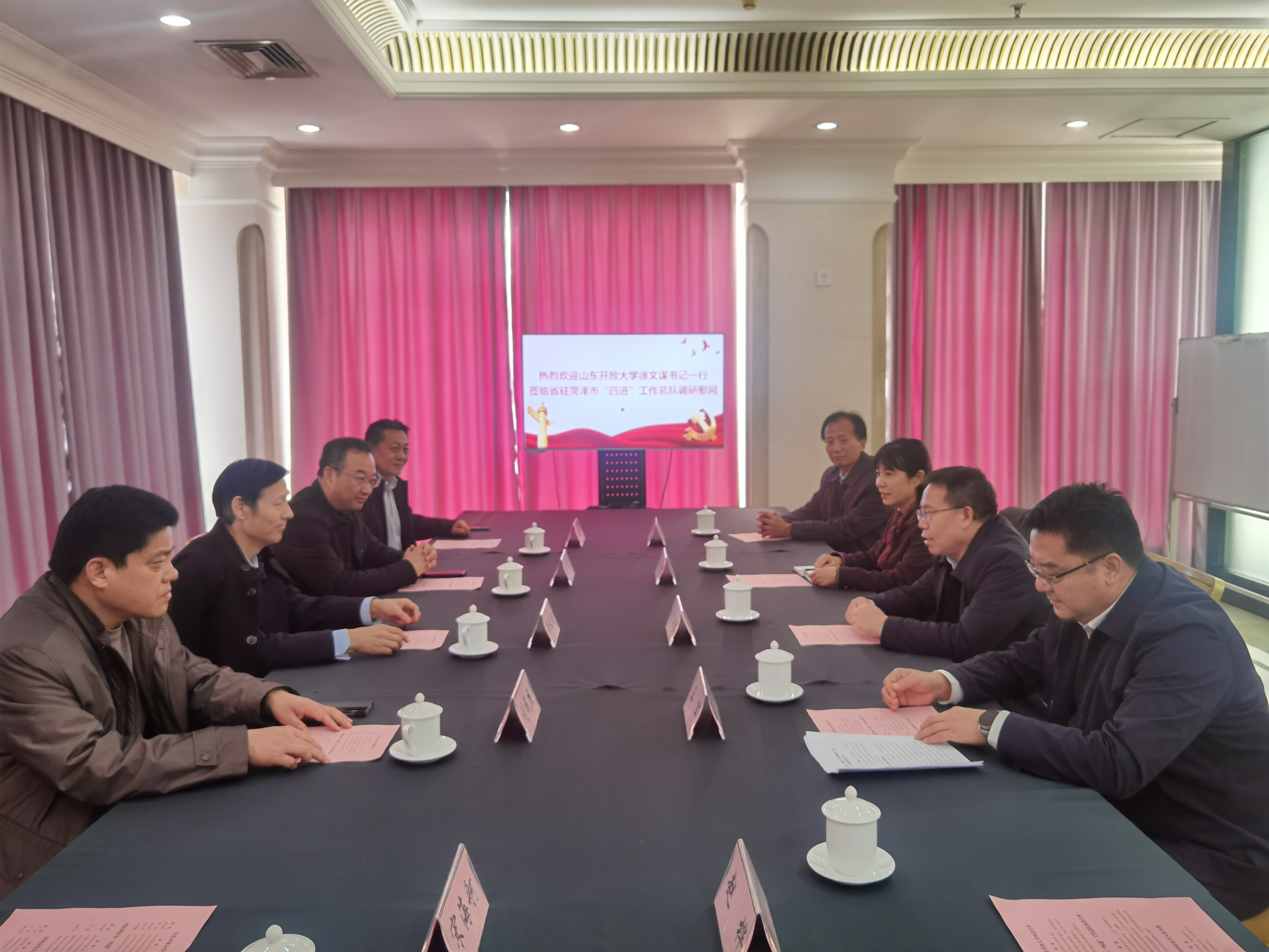 徐文谋一行先后到菏泽市、济宁市梁山县看望慰问了省驻菏泽市“四进”工作总队、济宁市梁山县“四进”工作支队队员,与工作队队员进行了座谈交流,听取了工作队的工作汇报,详细询问了队员们在工作、生活中遇到的困难和问题。徐文谋代表学校党委对菏泽市委、市政府、梁山县委、县政府给予我校派出干部在工作上的指导和支持、生活上的关心和帮助表示感谢,表示学校将一如既往全面支持省派工作队工作,积极帮助排忧解难,共同促进当地经济社会高质量发展。徐文谋强调,派出干部要紧密依靠当地党委、政府、党员干部和广大群众,扑下身子、虚心学习,扎实工作,积极作为,用心用情用力为群众办实事办好事,充分展示学校干部的良好形象,为地方经济社会发展贡献积极力量。期间,徐文谋一行到菏泽职业学院开展调研,参观菏泽市产教融合大学科技园,实地考察了产教融合等情况。