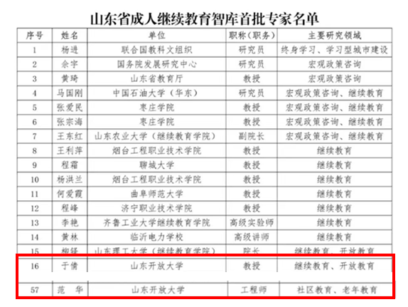 近日,山东成人教育协会公布山东省成人继续教育智库首批专家名单,共121名专家入选。我校于倩教授、范华正高级工程师凭借在相关领域的深厚学术造诣和突出贡献成功入选。
