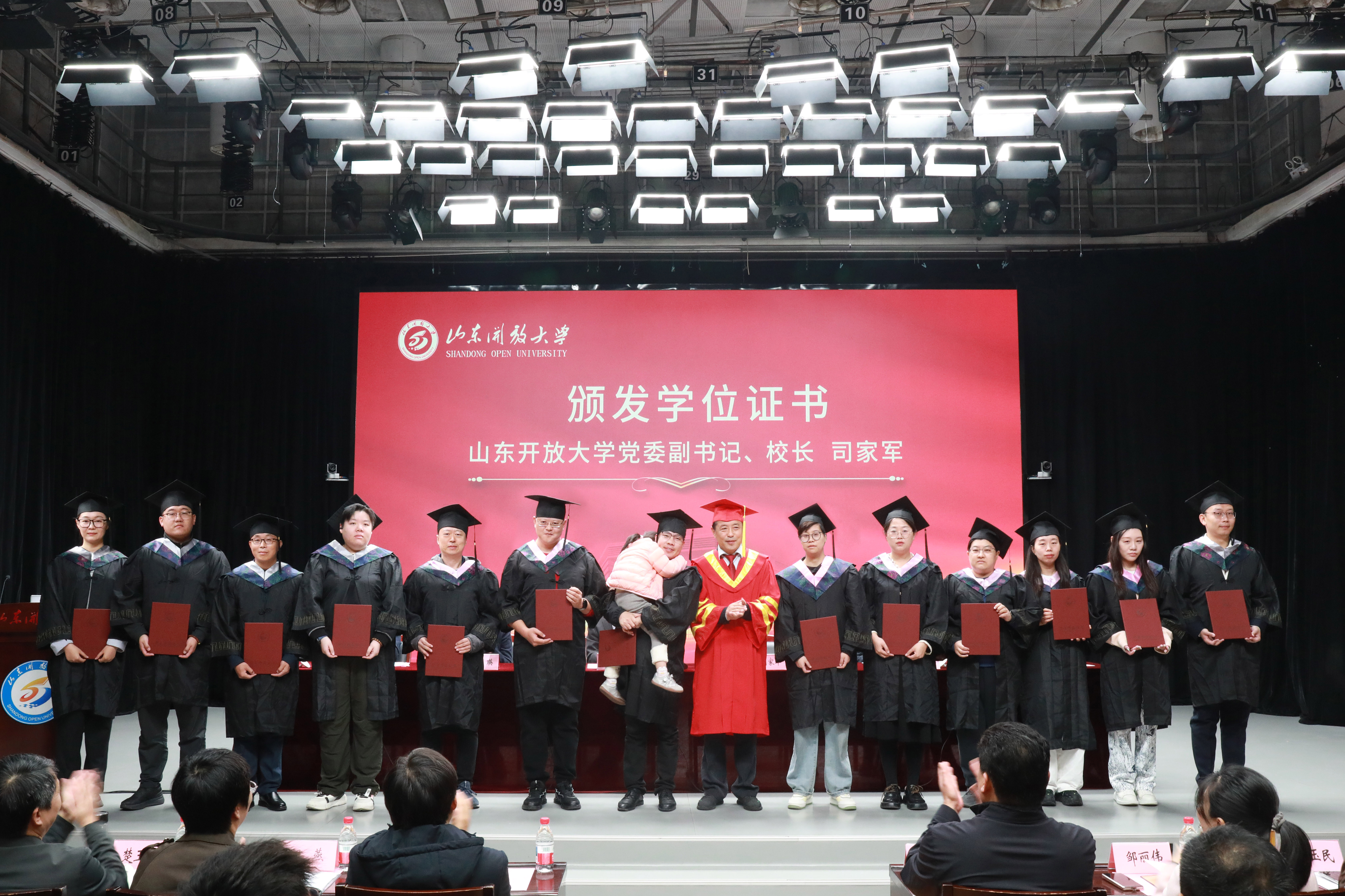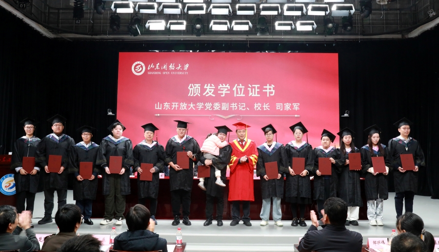 9时,典礼正式开始。全体起立,奏唱中华人民共和国国歌。王瑛宣读了《山东开放大学关于表彰2024年度开放教育荣誉毕业生的决定》。吕文波宣读了《国家开放大学关于授予5765名本科毕业生学士学位的决定》《关于公布国家开放大学2025年优秀学位论文评选结果的通知》,其中山东开放大学135名学生荣获学士学位称号、4名学生论文获评国家开放大学优秀学位论文、4名指导教师获评国家开放大学优秀论文指导教师。随后,全体校领导分别为荣誉毕业生颁发证书,为毕业生代表颁发毕业证书。司家军为获得学士学位的学生代表执拨穗礼,并颁发学位证书。