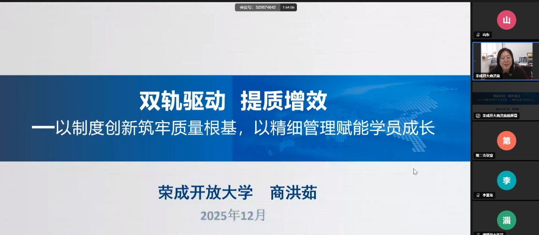 会上,教务处负责人对2025年开放教育教学督导工作进行了全面深入的总结,通报了网上教学、直播教学、教学团队建设、学位工作及综合教学检查等方面的工作进展,并对下一阶段教学督导任务作出部署。淄博开放大学以《强化体系联动,聚焦质量提升》为题,分享了市校统筹与区县联动的督导经验;荣成开放大学以《双轨驱动,提质增效》为题,介绍了“督导+服务”并行的闭环管理机制。