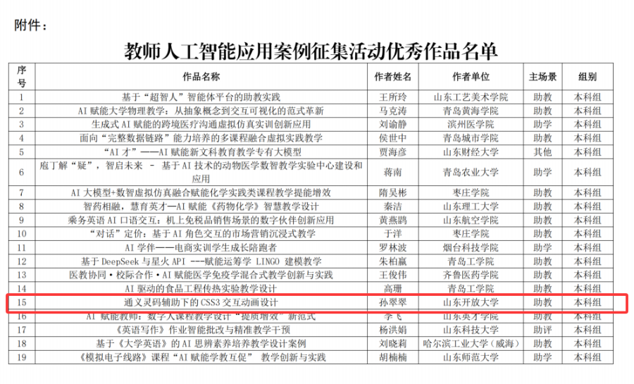 近日,山东省教育厅发布《关于公布人工智能应用案例征集活动优秀作品的通知》,我校理工教学部副教授孙翠翠申报的人工智能应用案例《通义灵码辅助下的CSS3交互动画设计》成功入选本科组优秀作品名单。