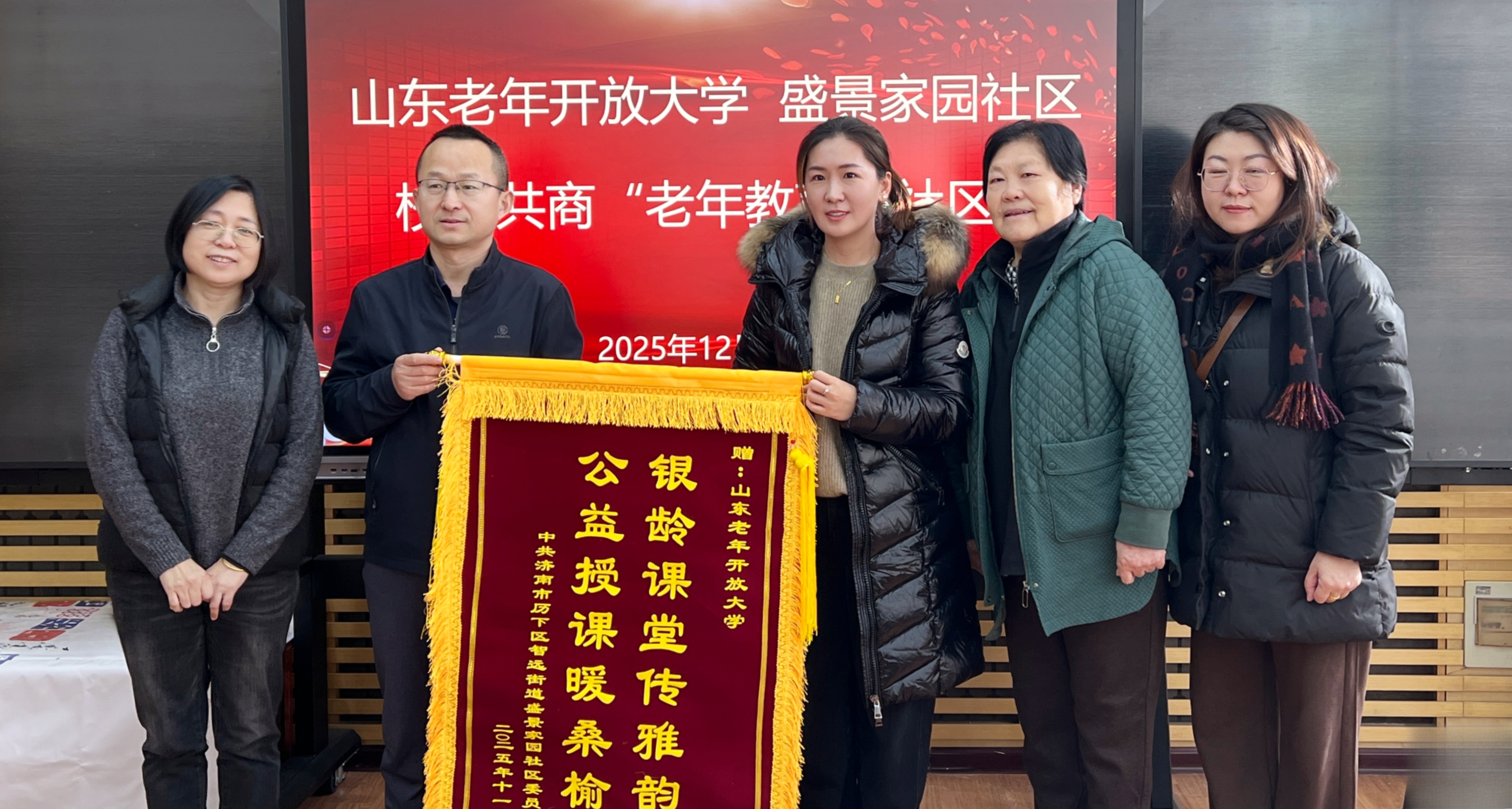 12月3日上午,济南市智远街道盛景家园社区党委书记、居委会主任林娜娜携老年学员代表一行到访我校,专程送来一面写有“公益授课暖桑榆 银龄课堂传雅韵”的锦旗,对我校老年教育送教服务表达诚挚谢意。