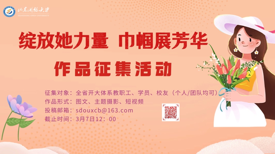 3月3日,党委宣传部面向全省开大体系开展“绽放她力量・巾帼展芳华”作品征集活动。活动期间,共征集30余件作品,作品涵盖图文、短视频、主题摄影等不同形式,并在学校官方微信公众号等平台进行了集中展示,充分展现了全省开大体系女性教职工、学员、校友在工作、学习和生活中的精彩瞬间与卓越风采,大力弘扬了女性自尊、自信、自立、自强的精神风貌,营造出温馨和谐、充满活力的校园文化氛围。