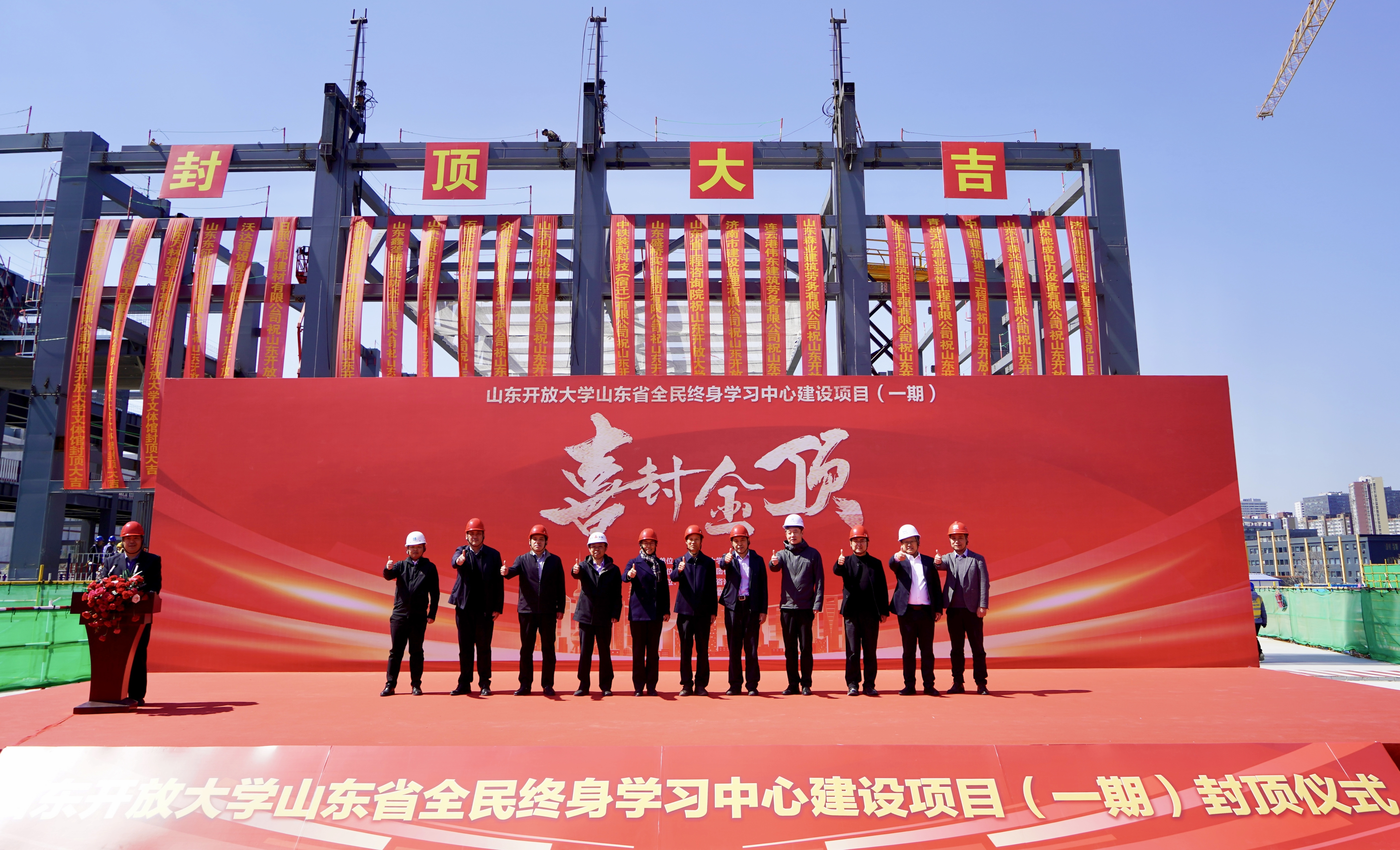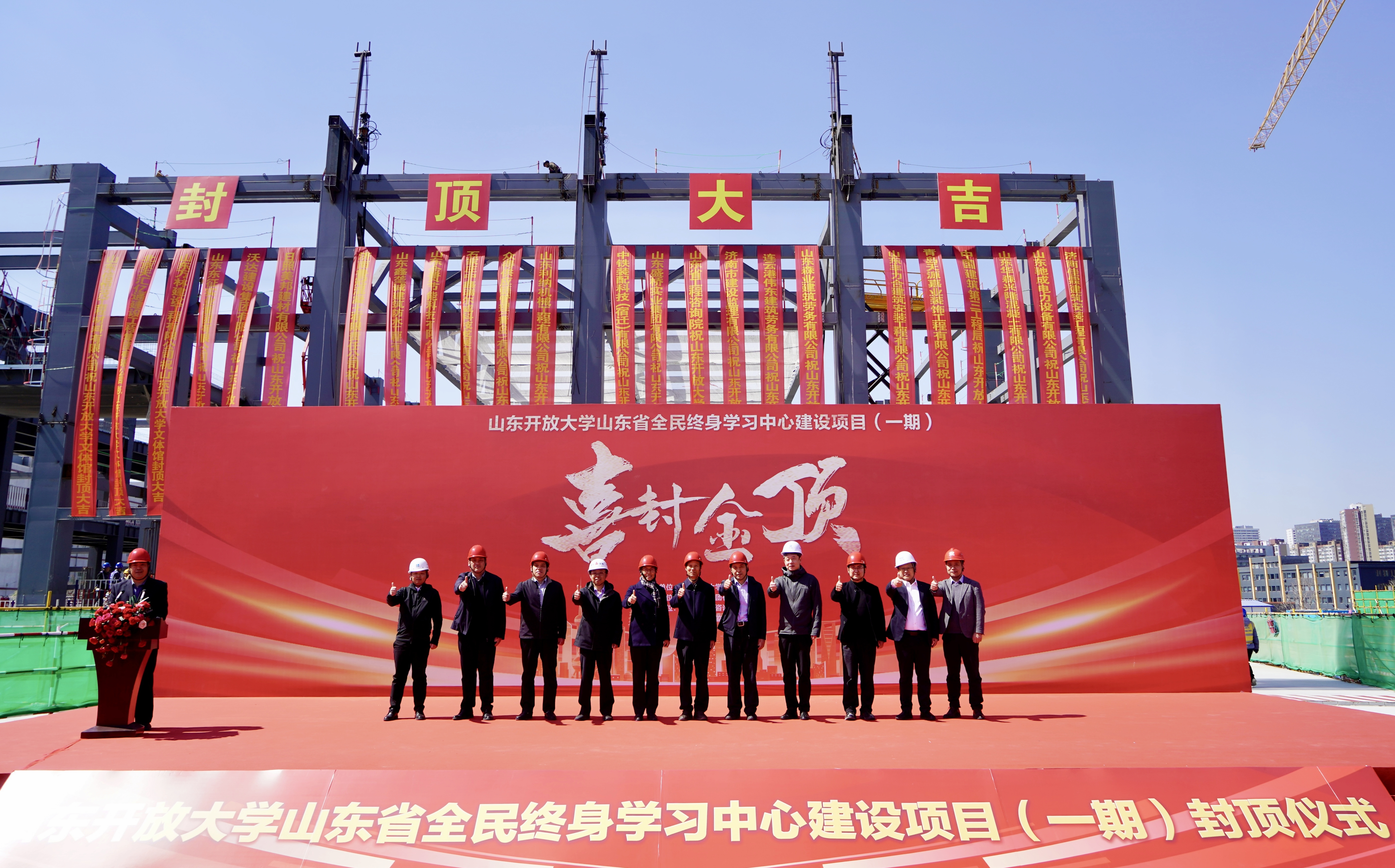 仪式开始,徐文谋宣布山东省全民终身学习中心建设项目(一期)文体馆主体桁架提升。伴随着音乐响起,桁架稳步升至标高位置,文体馆正式完成了主体结构封顶。