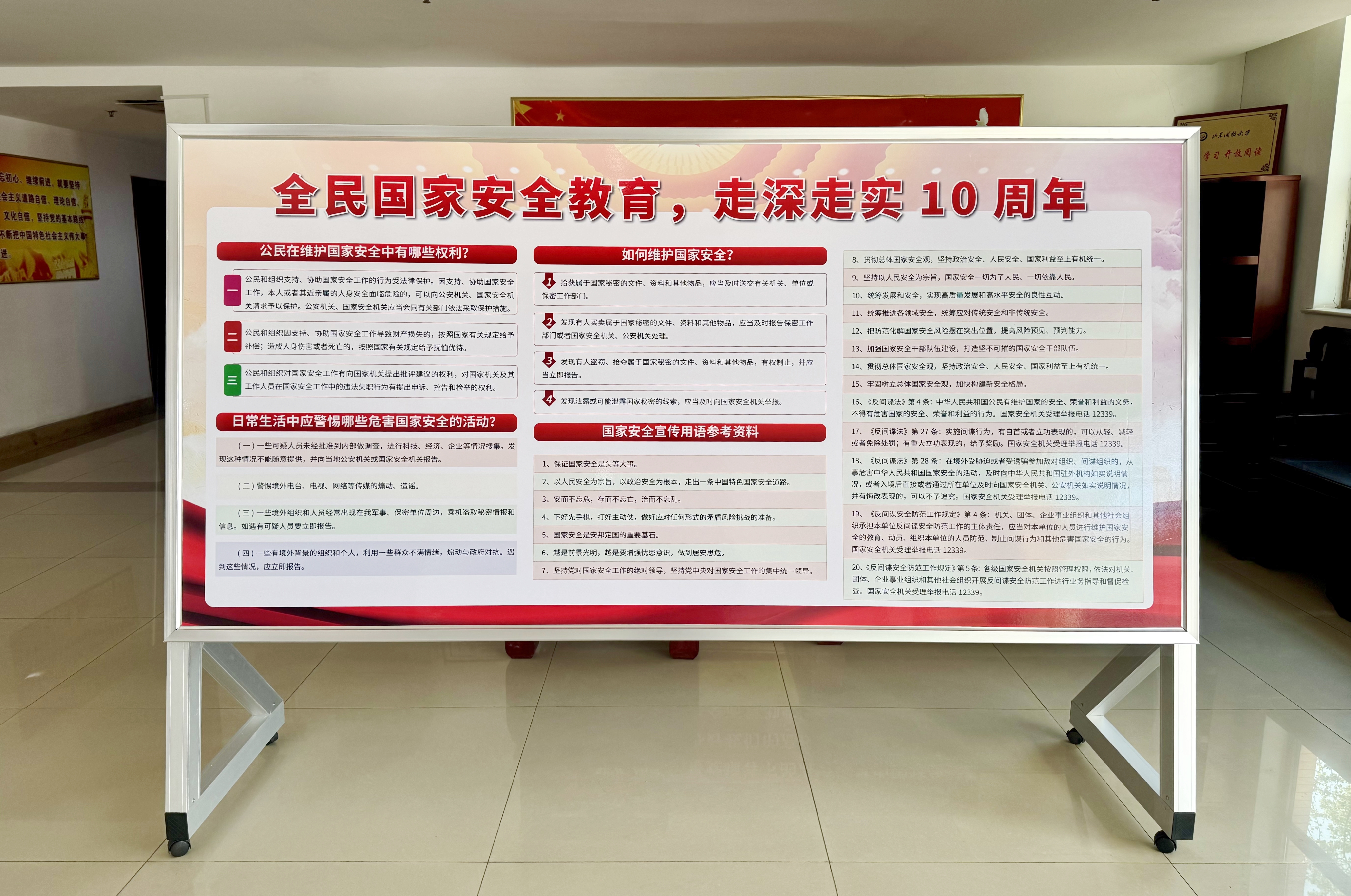 在第十个全民国家安全教育日之际,山东开放大学围绕“全民国家安全教育 走深走实十周年”主题,深入开展国家安全宣传教育活动,引导师生深入学习十年来国家安全领域发生的历史性变革、取得的历史性成就,积极践行总体国家安全观,让关心国家安全、维护国家安全成为全校师生的思想共识和行动自觉,筑牢国家安全防线。