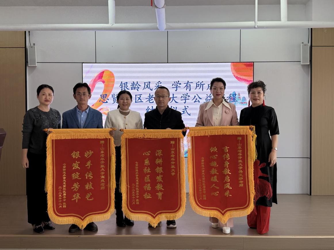 1月6日下午,我校老年教育学院受邀参加济南市七贤街道思贤社区老年公益课程结业仪式,并代表学校接受社区赠送锦旗。
