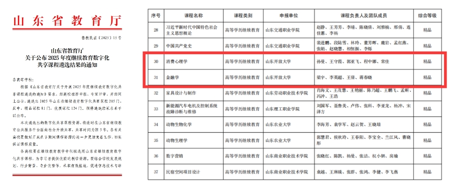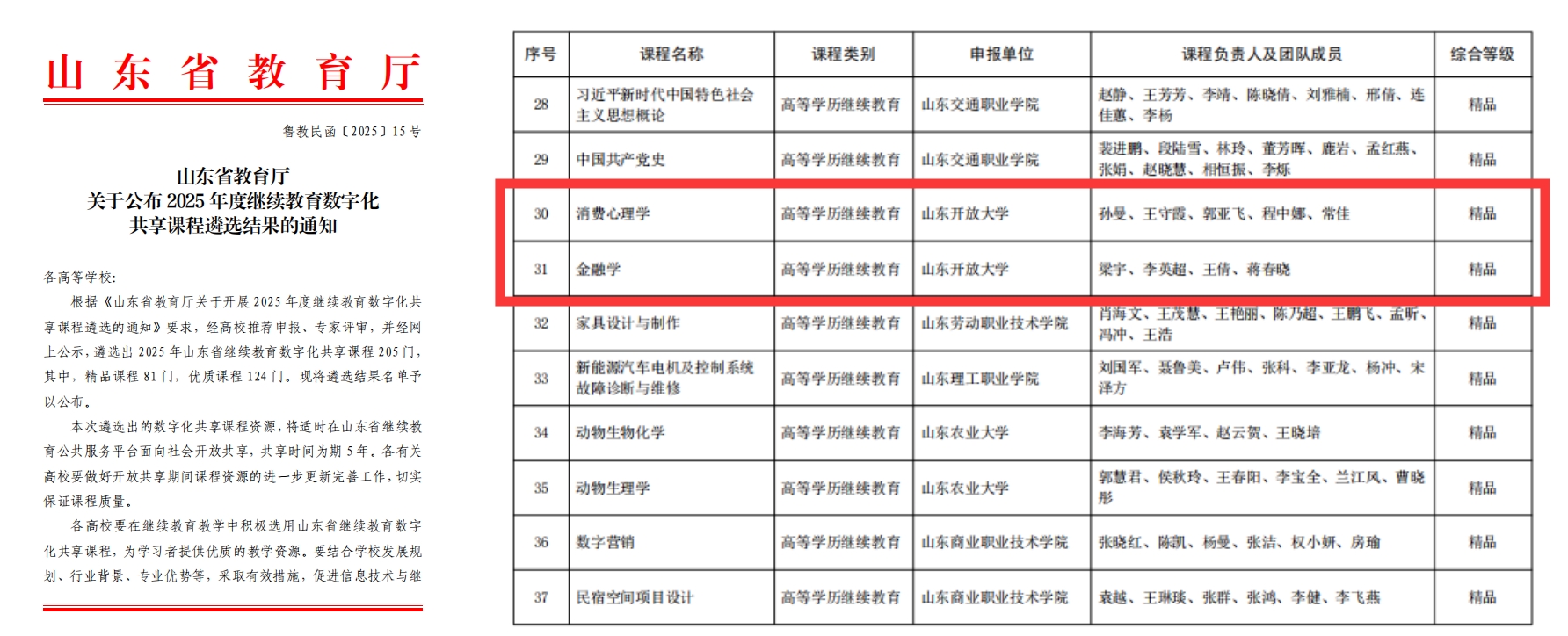 在山东省继续教育数字化共享精品课程遴选工作中,我校经济管理教学部孙曼团队申报的《消费心理学》、梁宇团队申报的《金融学》入选,综合等级评定为精品级,充分彰显了我校教师继续教育课程建设的扎实功底与优质水平。