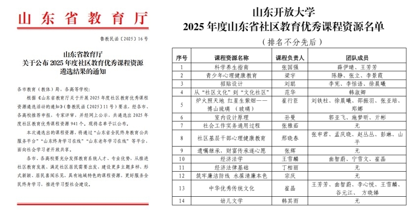 近日,山东省教育厅陆续公布2025年度继续教育数字化共享课程、2025年社区教育优秀课程资源遴选结果,我校16门课程成功入选。