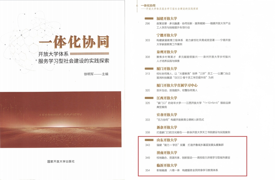 入选案例分别为:村(社区)干部学历教育案例《强健“能力+学历”双翼 打造齐鲁城乡基层发展头雁集群》(作者:宁继红、亓金锋),济南开放大学《校地融合、资源共享、创新驱动——高校助力济南学习型城市建设》(作者:王新程、池海、韦娜),以及临沂开放大学《职继融通 六维一体 构建服务全民终身学习教育体系》(作者:宁良强)。