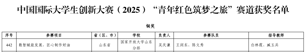 近日,教育部公布中国国际大学生创新大赛(2025)获奖名单,兖州开放大学选送的项目《数智赋能发展,匠心制作好油》在“青年红色筑梦之旅”赛道中脱颖而出,荣获铜奖,实现了我校在该顶级赛事中的历史性突破。