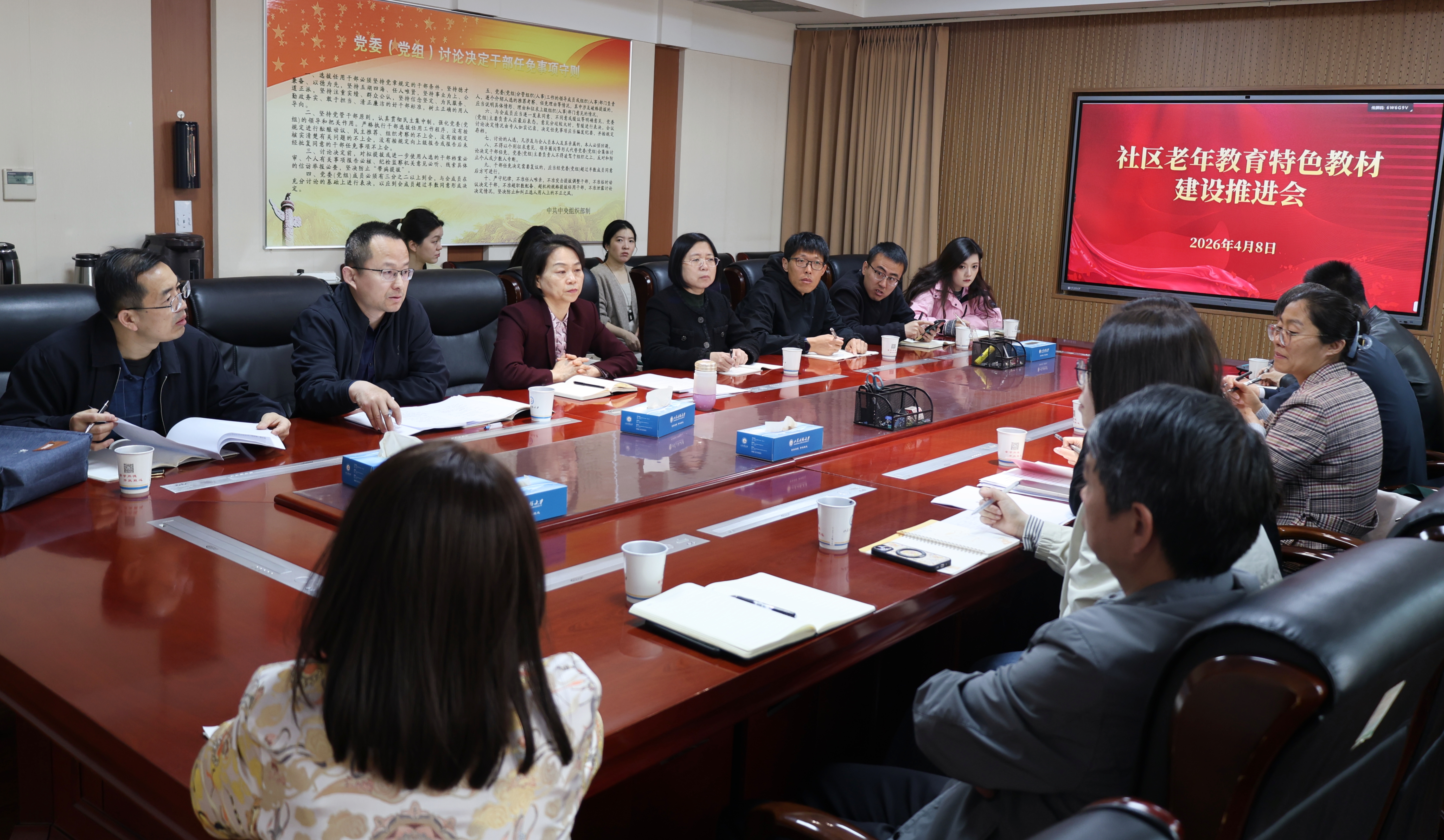 会上,老年教育学院负责人汇报了教材建设整体情况;《艺术书法生活》《健康生活》《文化生活》《财经生活》《咱山东的文化家常课》《富过三代 我的财富我做主》6本教材项目负责人依次汇报编写进展及下一步计划;学习资源中心负责人解读了自编教材管理及验收规范;山东美术出版社就教材编写规范、出版流程等进行专业指导。